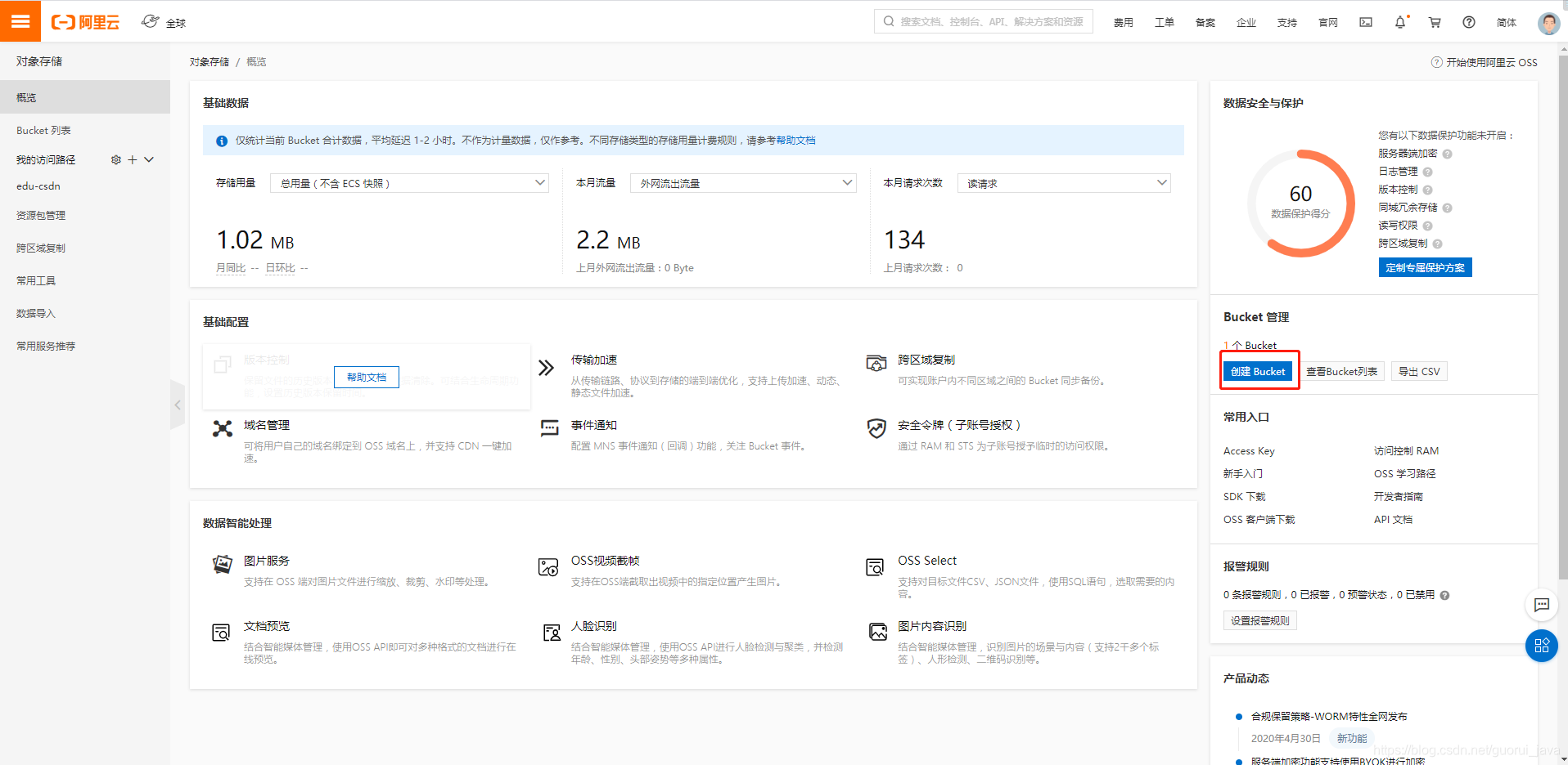 创建bucket,获取AccessKey ID和AccessKey Secret。