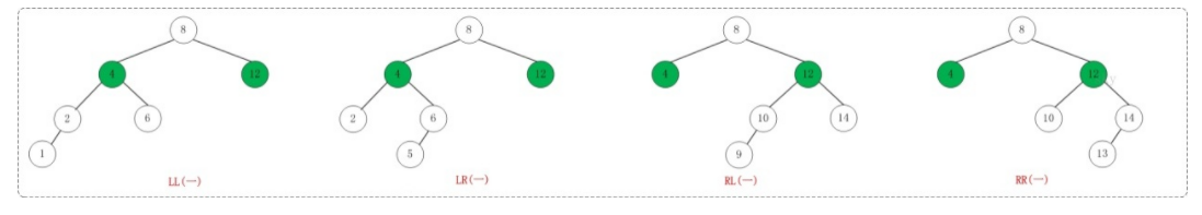 如果在AVL树中进行插入或删除节点,可能导致AVL树失去平衡,这种失去平衡的二叉树可以概括为四种姿态:LL(左左)、RR(右右)、LR(左右)、RL(右左)。它们的示意图如下: