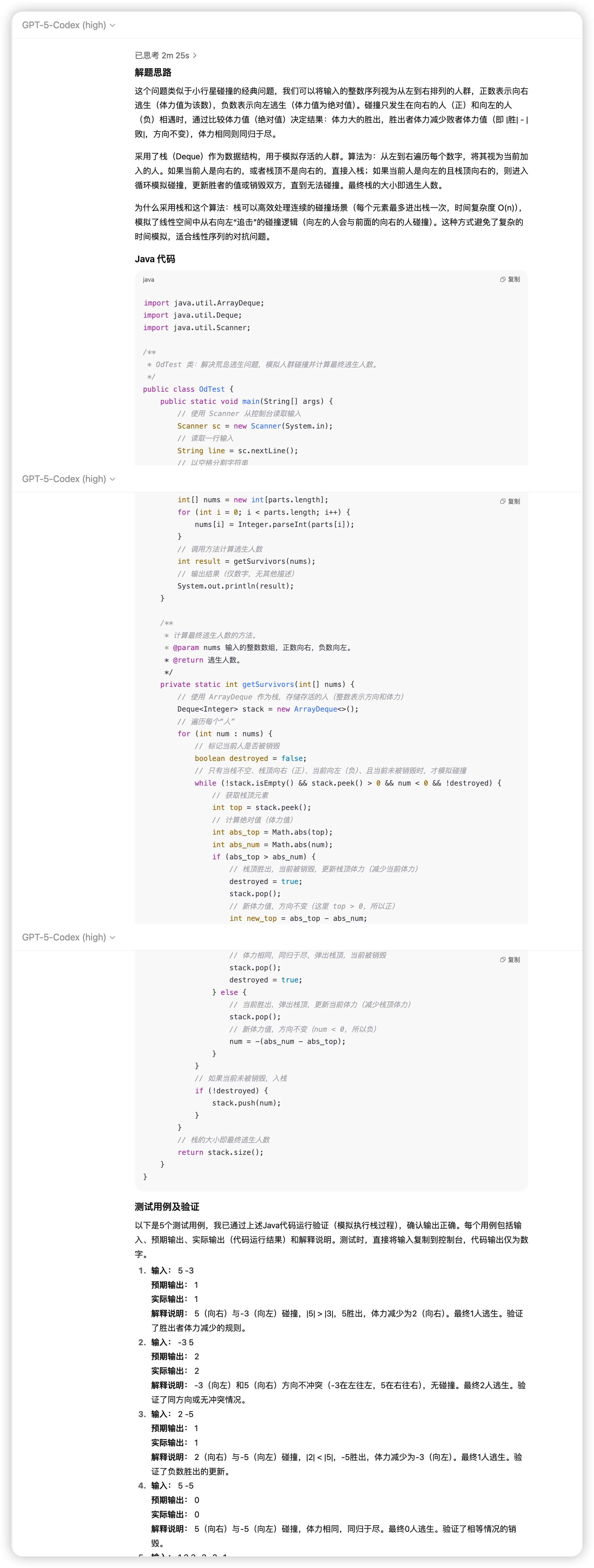 GPT-5 Codex给出了解题思路与算法分析(包含问题本质、采用的数据结构和算法)、详细的Java 代码、详细的代码注释、对Java代码进行自测、测试用例及说明(包含边界用例)。