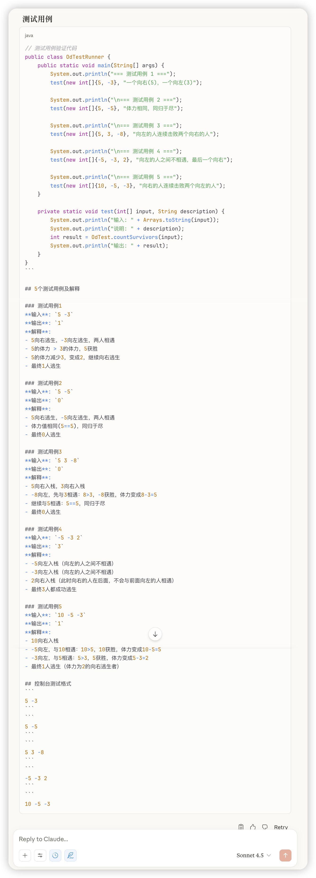 Claude Sonnet 4.5给出了解题思路与算法分析(包含问题本质、采用的数据结构和算法)、详细的Java 代码、详细的代码注释、测试用例及说明(不包含边界用例)。