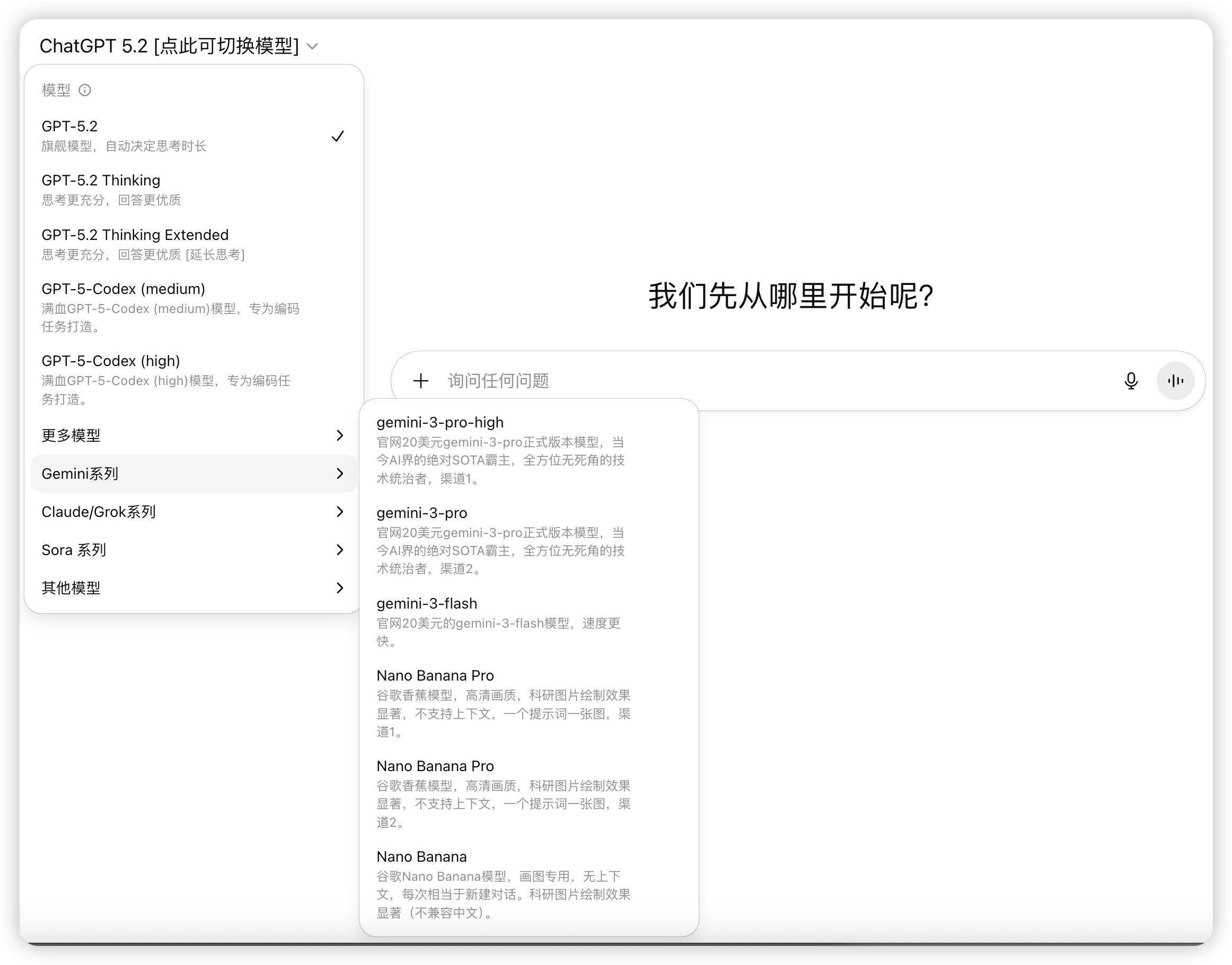 包含GPT-5.2、GPT-5.2 Thinking、Gemini 3 Pro、Gemini 3 Flash、香蕉🍌Nano Banana Pro、Claude Sonnet 4.5、Codex、Sora2、Grok4.1等模型。