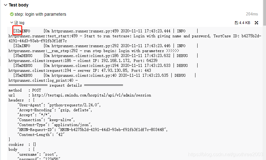 5. 上面的问题解决后,我们会发现测试报告中,我们打开日志时会出现下面红框中的数据