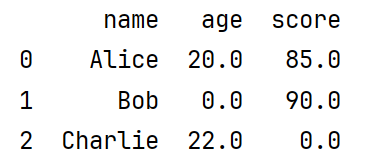 print(data) #[('Alice', 20., 85.) ('Bob', 0., 90.) ('Charlie', 22., 0.)]