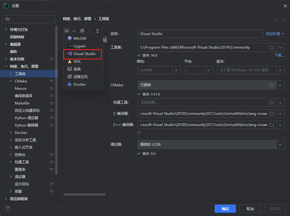 打开 “文件”-->“设置”,然后打开“构建、执行、部署”-->“工具链”,在工具链中添加VS2019的工具链