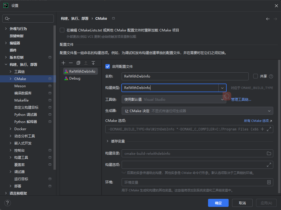 打开 “文件”-->“设置”,然后打开“构建、执行、部署”-->“CMake”,添加构建类型为RelWithDebInfo的配置文件
