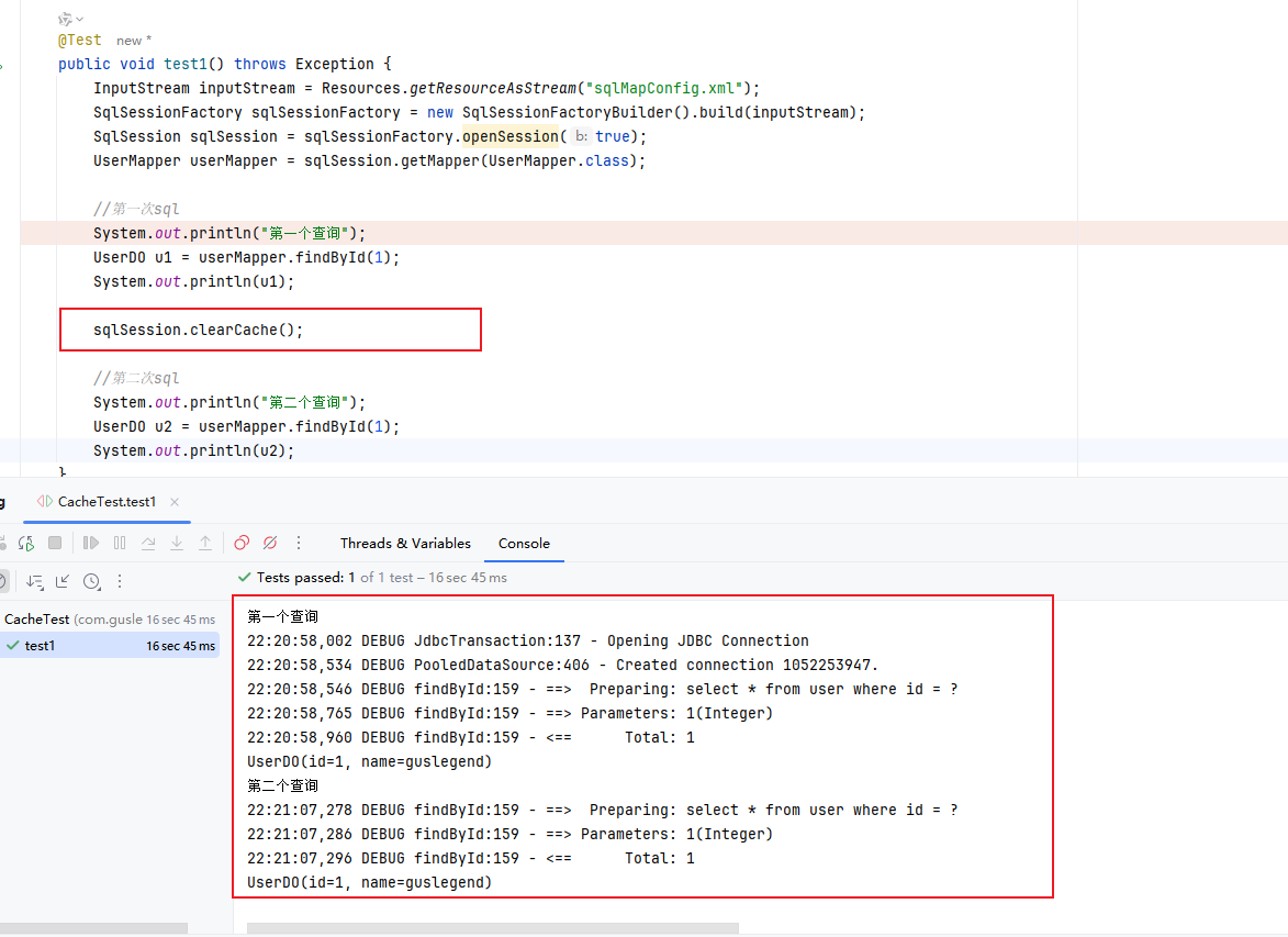 然后我们只添加了一行sqlSession.clearCache(),就发现打印了两行sql语句。