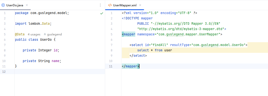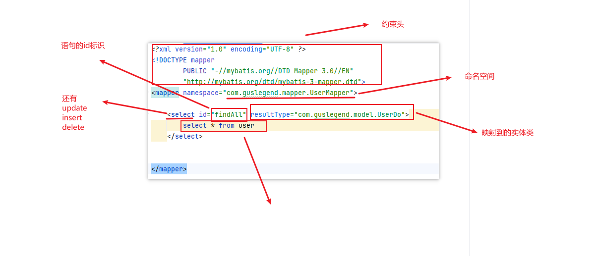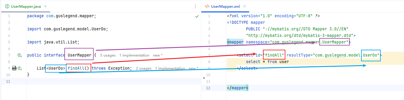 List<UserDo> userDoList = sqlSession.selectList("com.guslegend.mapper.UserMapper.findAll");