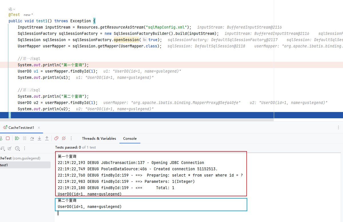 可以观察到两个不同的sqlSession,第一个关闭了,第二个查询依然不发出sql查询语句。