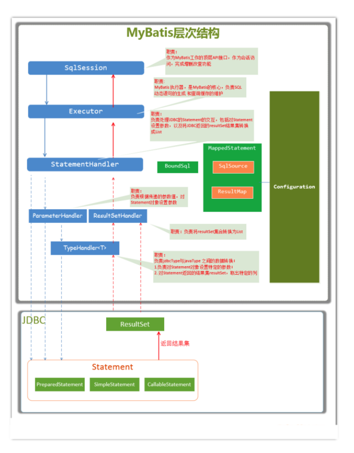 - 处理操作请求:触发条件(API接口层请求过来),传入参数(为SQL的ID和传入参数对象),处理过程(A.根据sql的ID查找对应的MappendStatment对象;B.根据传入参数对象解析MappedStatement,得到最终要执行的SQL和执行传入参数;C.获取数据库连接,根据的得到的最终SQL语句和执行传入参数到数据库执行,并得到执行结果;D.根据MappedStatement对象中的结果映射配置对得到的执行结果解转换处理,并得到最终的处理结果;E.释放连接资源)。