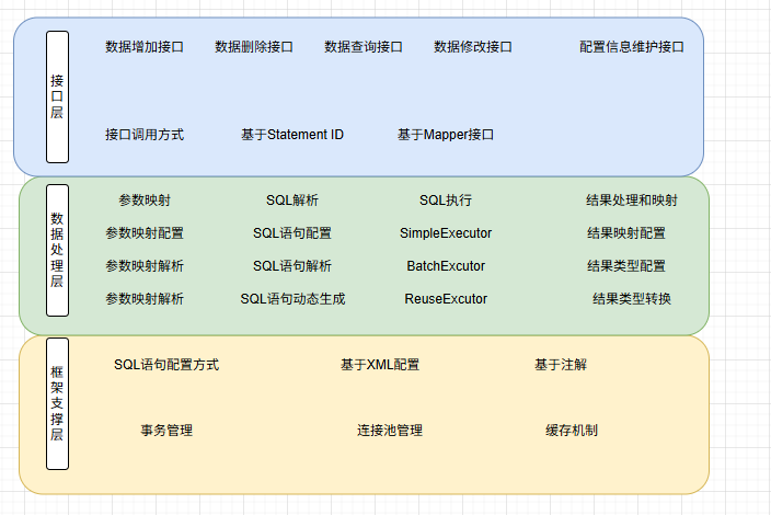 - 基础支持层:负责最基础的功能支撑,包括连接管理,事务管理,配置加载和缓存处理,这些都是共用的东西,将它们抽取出来作为最基础的组件,为上层的数据处理层提供最基础的支撑。