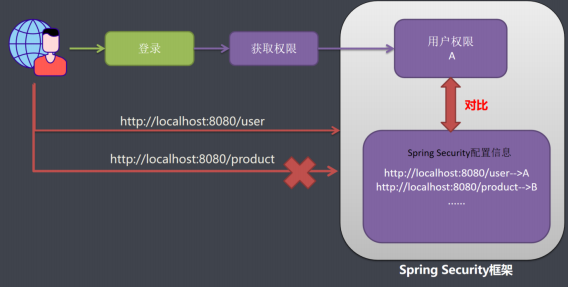 - 另一份数据就是用户权限信息:请求用户拥有权限,系统用户发送一个请求,系统配置信息和用户权限进行对比,如果对比成功则允许被访问。