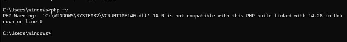 如果出现:PHP Warning: 'C:\WINDOWS\SYSTEM32\VCRUNTIME140.dll' 14.0 is not compatible with this PHP build linked with 14.28