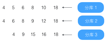 相对第一次查询,第二次查询条件放宽了,故第二次查询会返回比第一次查询结果集更多的数据,假设这三个分库返回的数据(time, uid)如下:
