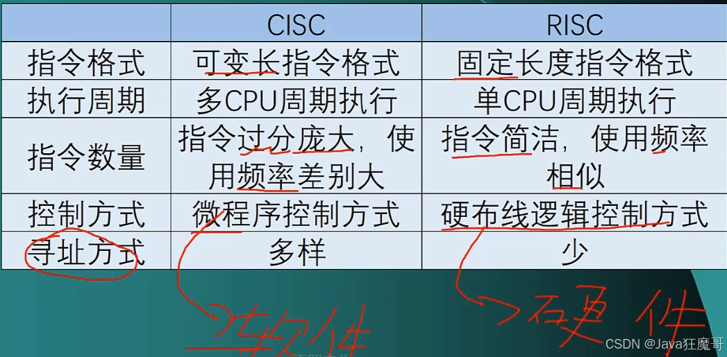 - CISC:复杂指令系统,基本思想是进一步增强原有指令的功能,用更为复杂的新指令取代原先由软件子程序完成的功能,普通个人电脑的CPU多用。