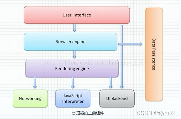 (3)渲染引擎:负责显示请求的内容。解析HTML和css内容,并且将解析的内容显示在屏幕上。(chrome与其他浏览器不同,每个标签页对应一个呈现引擎实例,每个标签页都是一个独立的进程)