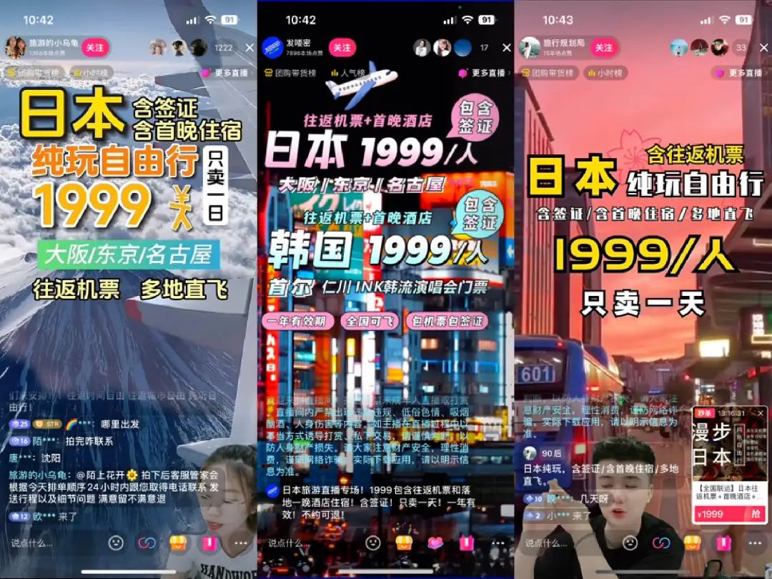 1999元,北京飞上海往返都不够,但却能让你去日本地图上随便选,痛快地玩一天;3599元,可能往返广州吃的烧鹅还没到嘴边,但却能飞到俄罗斯玩上9天,还能住四星级酒店.......这些令人想不到的低价出境游,正在攻占抖音直播间。