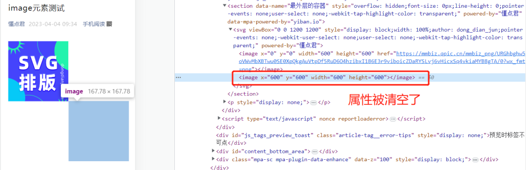 懂点君通过Chrome浏览器调试发现,xlink:href属性在公众号文章里被过滤掉了,也就是这个属性直接被清空了,所以才导致xlink:href属性在公众号上无法正常显示图片。另外,xlink:href属性已经被抛弃了,开发的时候也不推荐使用这个属性了!