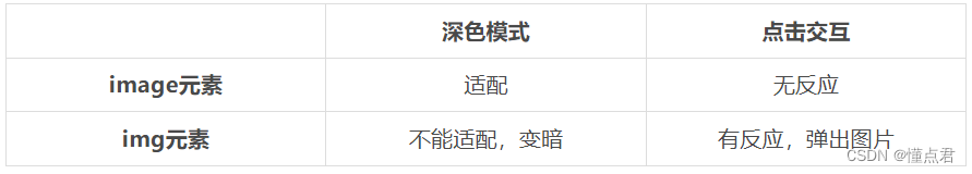深色模式下显示的效果:image元素引入的图片显示正常,能够适配深色模式;img元素引入的图片变暗,不能适配深色模式(第一张图片);