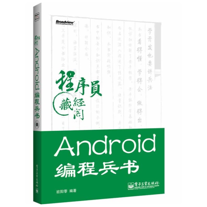这是一本Android开发书籍,内容讲解详细,例子丰富,能帮助读者举一反三。在《Android编程兵书》中,每一个知识点的描述都非常详细,并且每一个知识点都会有一个小小的实例,使读者更容易上手Android开发。同时,对于不熟悉Java语言的人来说,也是一本好书,《Android编程兵书》主要是从Android开发最简单的内容开始,慢慢地逐层深入,最后结合项目的开发进行详细讲解。