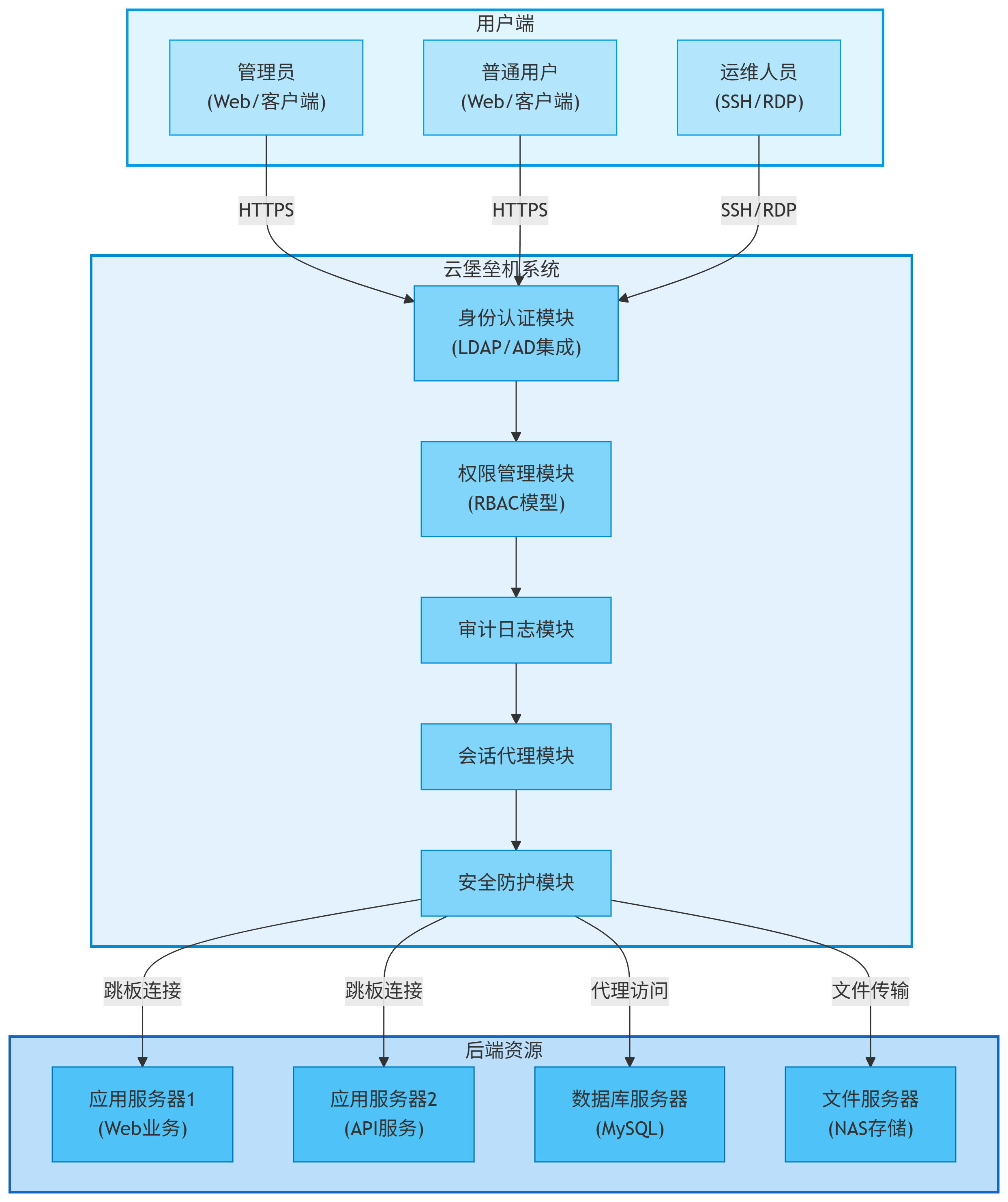 云堡垒机作为核心安全网关,构建了一个完整的安全架构: