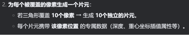 解释:每个片元(像素)携带着插值属性,即通过重心坐标计算的插值属性值