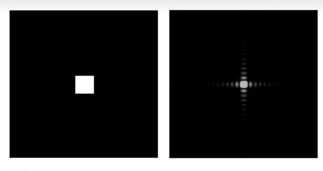 第二幅图将表示为这种图像,即中间白色部分为盒子的大小,因为盒子是全1(即白),其频域图在右边