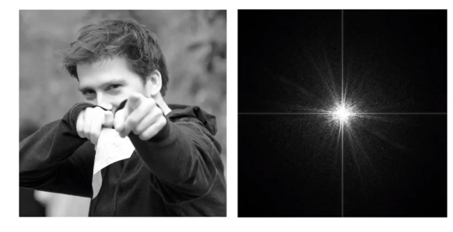 在上图中,右图为左图的傅里叶变换图,即从空间域转换到频域中,低频集中在中间,高频在四角(定义)。