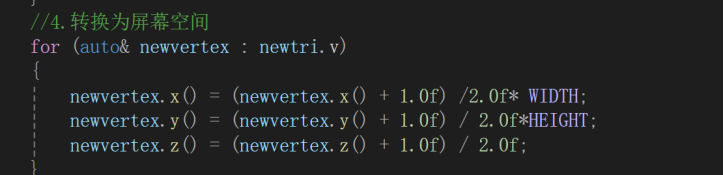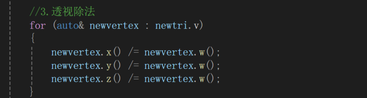 那么继续进行下一步,我们要进行透视除法,这个就是将三角形的x,y,z都除w即可