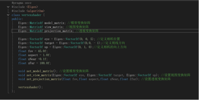 这样,我们就完成了输入数据的步骤,下一步就是对顶点进行变换,我们已经定义了vertexshader类,这个类中已经包含了MVP矩阵,所以我们只要在rasterizer类中引入一个vertexshader类的对象即可