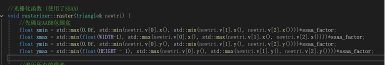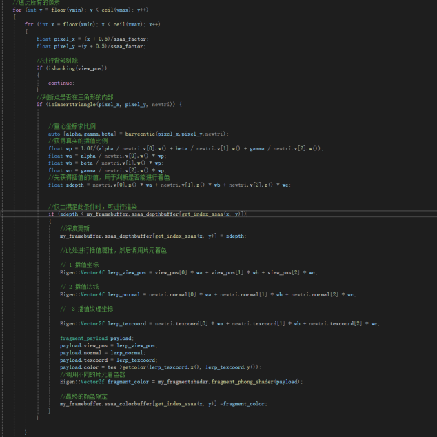 X,y代表的是像素的左下角,加上0.5后表示的是像素的中心,注意看三次舍弃,先背部剔除,然后判断像素点是否在三角形内部,最后进行深度测试,这里看着可能有点混乱,主要还是我比较懒,不太想改,这里你们把get_index_ssaa()当成get_index(),把ssaa_depthbuffer改成depthbuffer, 把ssaa_colorbuffer改成colorbuffer就行了,完成舍弃掉ssaa就行