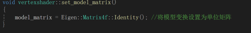 作用是从模型空间变换到世界空间,这里我们先使用单位阵即可,就是假设我们的模型已经处于世界空间