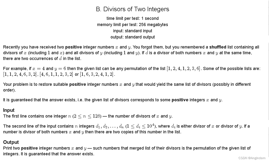 从给的样例我们可以知道,一定有一个最大的数作为 x 或者 y,所以我们把 这个最大的约数弄出来之后,再把剩下的数中的最大数一定就是 y 或者 x。