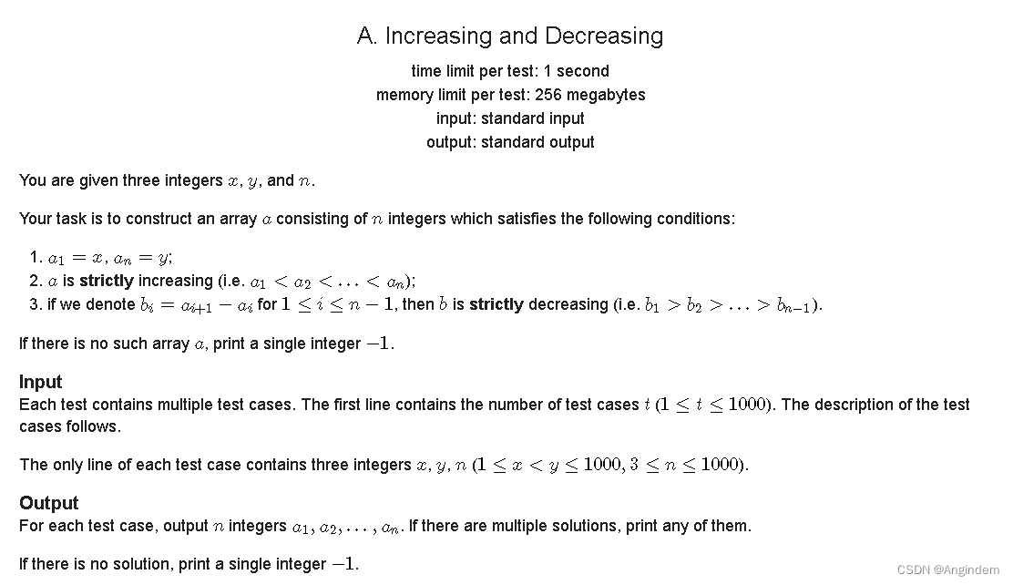文章讨论了一个关于数列的问题,给定起始值x、结束值y和项数n,判断是否能构造一个递减的等差数列。如果可用数字小于等差之和,输出-1,否则构建并输出数列。