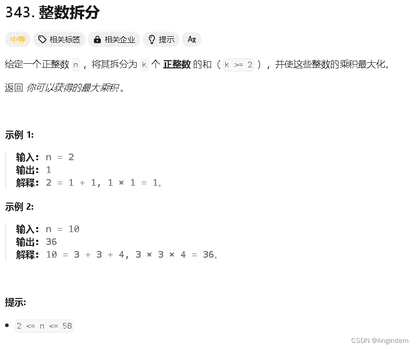对于整数拆分,就是多个子问题,我们通过解决一个子问题,来推出大问题,我们拆分的时候,按照逻辑一个数拆成两个数,比如: 6 = 2 + 4 或者 6 = 1 + 5 或者 6 = 3 + 3 ...等,其中 拆分了一个数之后,如果拆分得到的数不为 1 说明还是可以拆分,所以这时候我们可以得到了子问题的特征了,即 dp[N] 中 dp 的下标含义应该是什么, 我们dp下标的含义应该指向我们拆分的数,其中 dp[下标] 元素 含义那就是我们可以拆成后所求的结果。