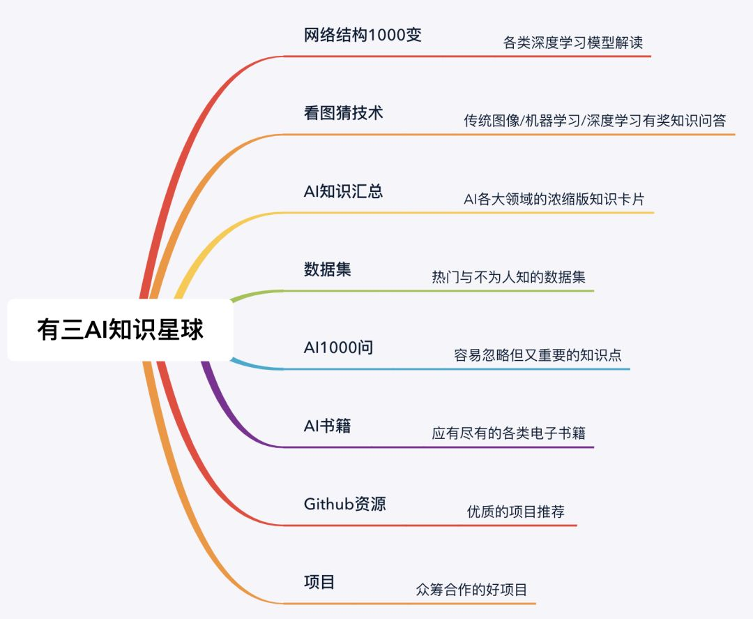 有三AI知识星球由言有三维护,内设AI知识汇总,AI书籍,网络结构,看图猜技术,数据集,项目开发,Github推荐,AI1000问八大学习板块。