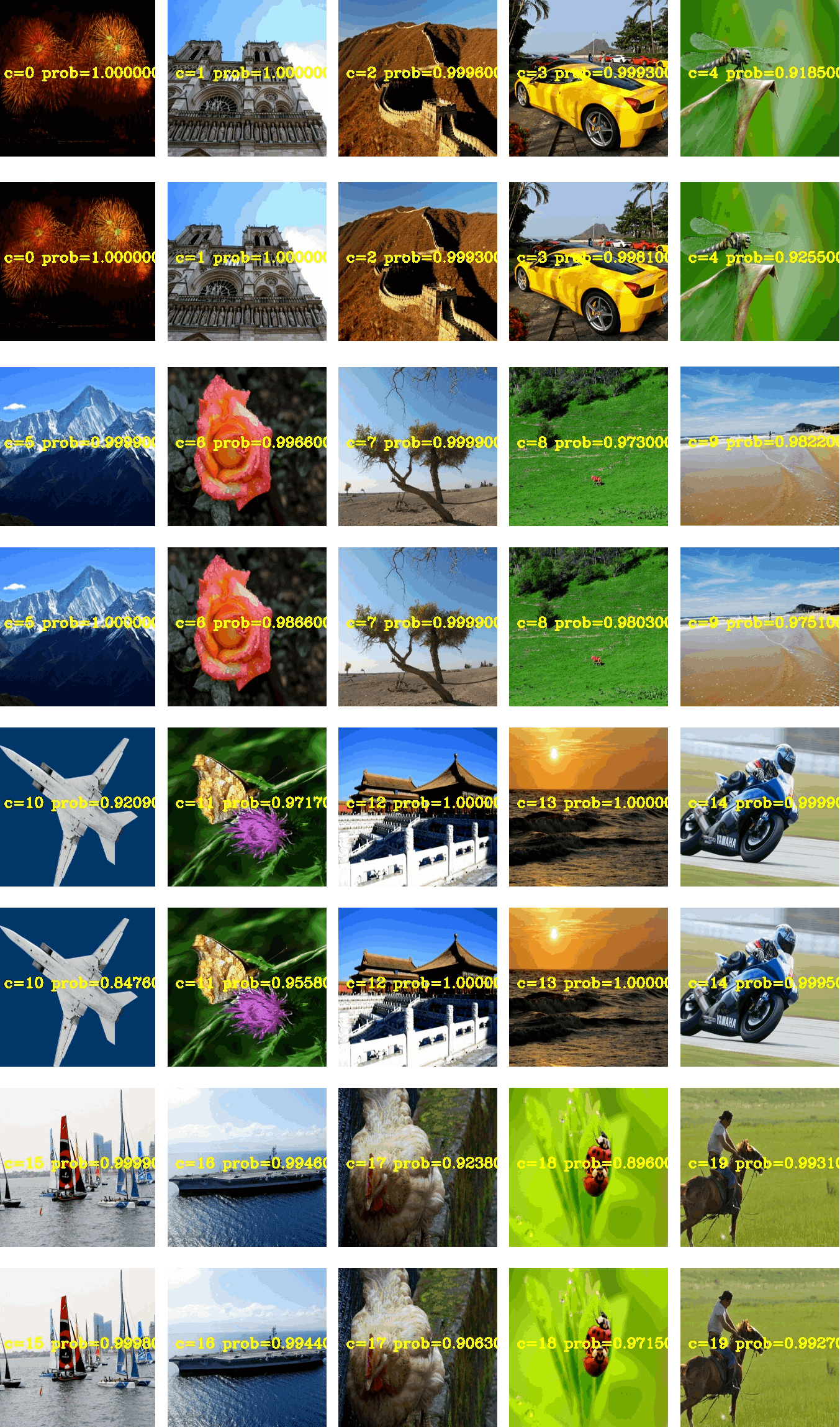 我们从20类中每一类随机选取一张图片来进行测试,比较量化前的模型推理结果和量化后的模型推理结果,下图展示了每一张图片的预测类别及经过Softmax映射后的概率,其中奇数行为量化前的模型推理结果,偶数行为量化后的模型推理结果。