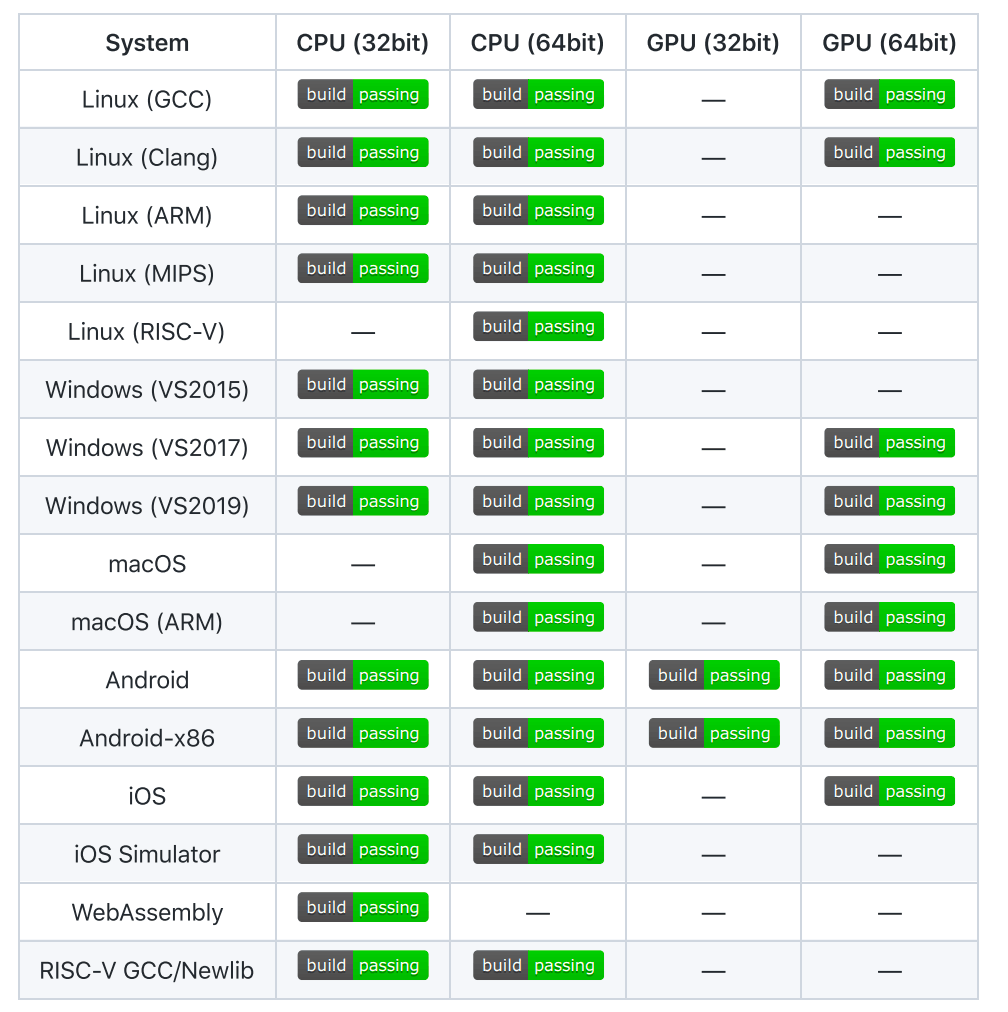 NCNN支持Intel架构的CPU与GPU,AMD架构的CPU与GPU,Arm架构的CPU与GPU,高通架构的CPU与GPU,Apple架构的CPU与GPU,其中对高通公司的CPU,ARM公司的CPU以及Apple公司的CPU提供了非常高效率地优化加速;