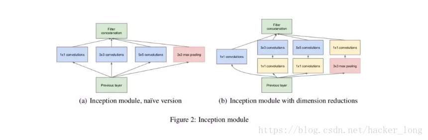 图b是对图a的改进,即在3*3卷积,5*5卷积前加1*1卷积,目的是为了先进行降维,相比较于原来结构减少了较多参数。而把1*1卷积放在3*3最大池化之后,相比较放在前面,也是为了参数量的减少。