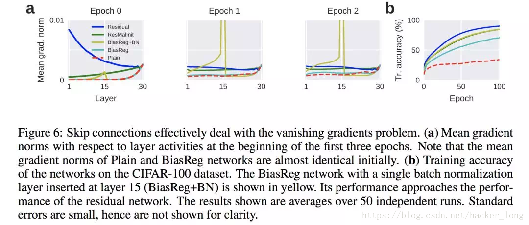 上面我们解释了skip connect改善了反向传播过程中的梯度消散问题,因此可以使得训练深层网络变得容易,但研究者们表示NoNoNo,没这么简单。