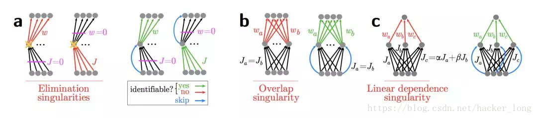 第1种(图a),输入权重矩阵(灰色部分)完全退化为0,则输出W已经失去鉴别能力,此时加上残差连接(蓝色部分),网络又恢复了表达能力。第2种(图b),输入对称的权重矩阵,那输出W一样不具备这两部分的鉴别能力,添加残差连接(蓝色部分)可打破对称性。第3种(图c)是图b的变种,不再说明。