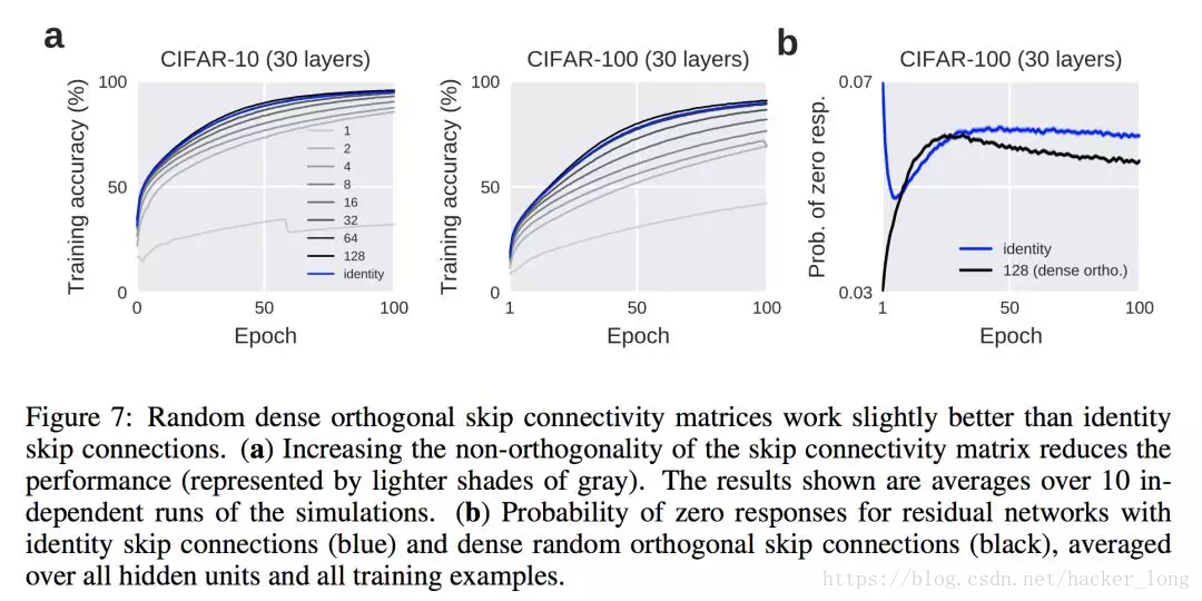 当然,resnet有改善梯度消失的作用,文中也做了实验对比如上:但不仅仅不如此,下图是一个采用残差连接(蓝色曲线)和随机稠密的正交连接矩阵的比对,看得出来残差连接并不有效。