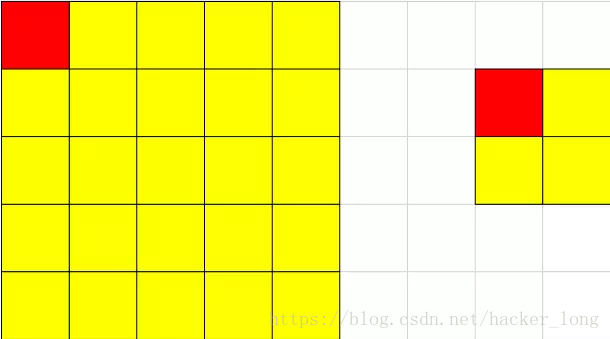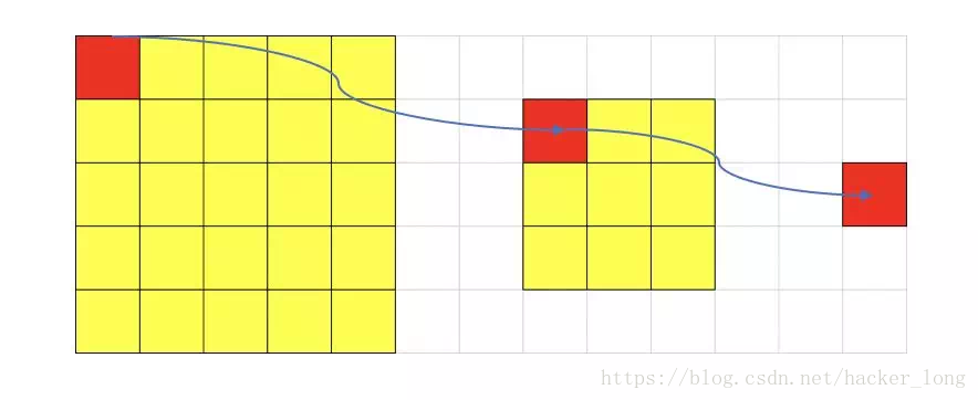 所谓感受野,即一个像素对应回原图的区域大小,假如没有pooling,一个3*3,步长为1的卷积,那么输出的一个像素的感受野就是3*3的区域,再加一个stride=1的3*3卷积,则感受野为5*5,我们看左上角像素的传播就明白了。