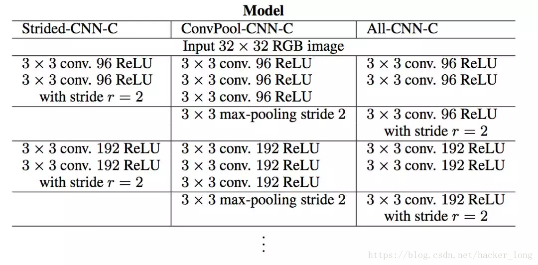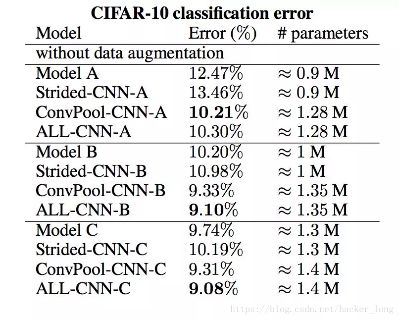 上面就是作者的实验结果,all-cnn-c相比convpool-cnn-c,就是在同等卷积层的基础上,去掉了pooling,结果B和C系列模型效果都是提升的,关于A,B,C系列具体细节大家可以参考文章。