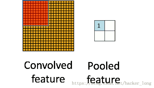 上图就是一个池化的示意图,用了一个10*10的卷积核,对20*20的图像分块不重叠的进行了池化,池化之后featuremap为2*2的大小。
