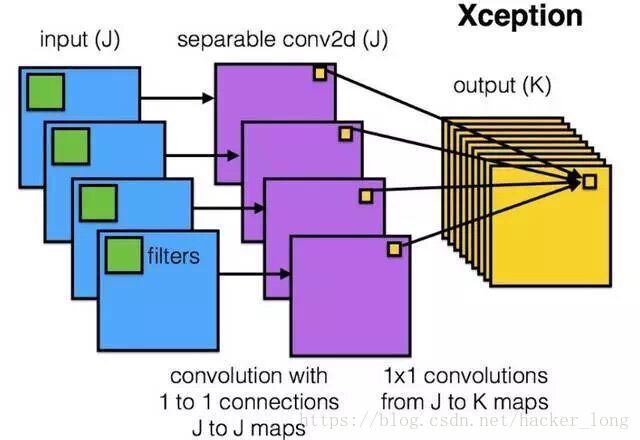 我们可以看到它由3*3的通道分组卷积(depthwise separable convolution)加1*1的普通卷积(point wise convolution)组成。它的组成结构本质上就是Xception结构,如下图。