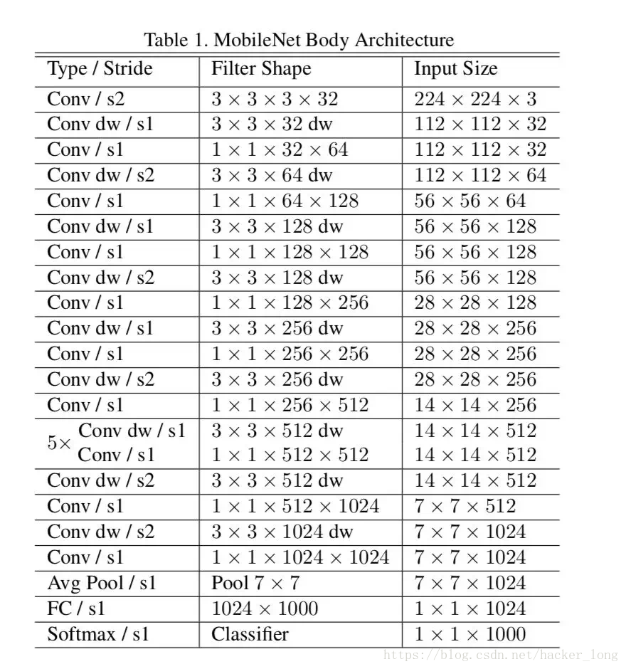 Mobilenets结构就是由这些depthwise sparable convolution+pointwise convolution线性叠加构成的。结构如下图。