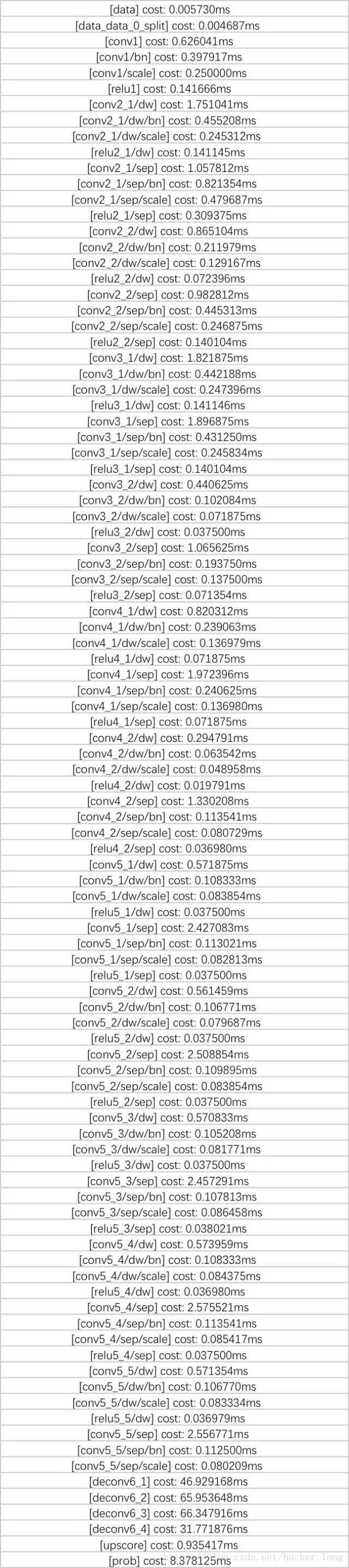 采用80*80输入,砍掉conv5_6和conv6,得到的模型各层花费时间如下