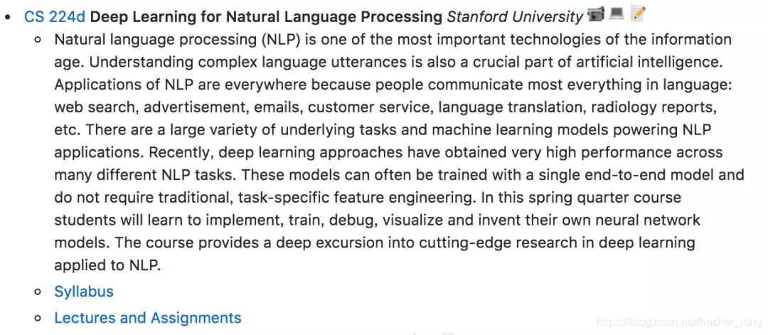 这里举一个自然语言处理NLP方向课程的例子,CS 224d。这个网站上会提供课程的相关内容介绍,课程笔记链接,还有作业。当然,你可以按照自己未来想要发展的方向选择课程的学习哦。