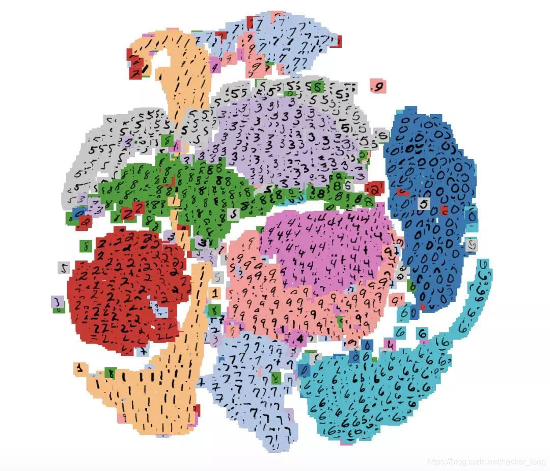 下图是t-SNE可视化结果图,可以看出,数字都有很明显的聚类效果。