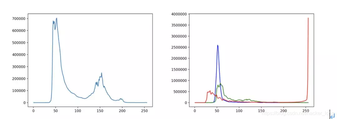 下面分别是上面灰度和彩色图的直方图。